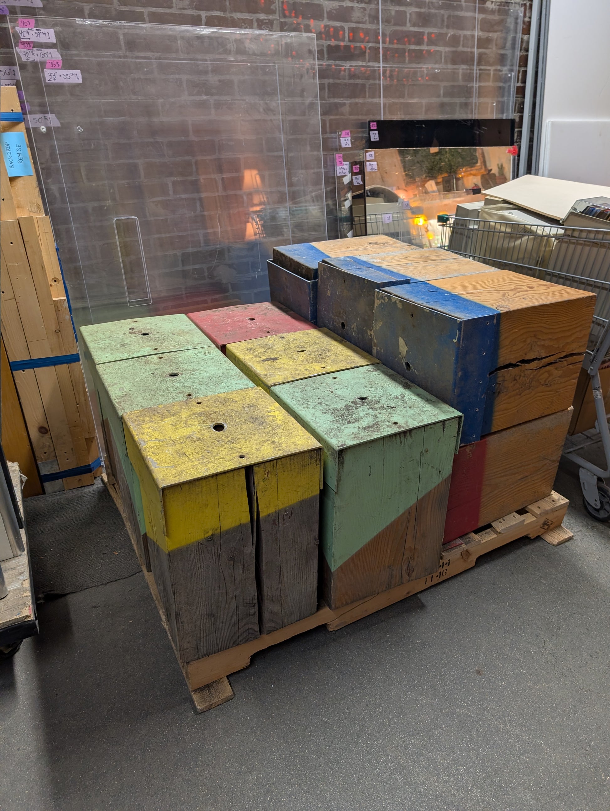 Banc d'extérieur fabriqué en bois d'épinette, partiellement peint en bleu, vert, rouge ou jaune. La plaque de métal se retire et le banc est réversible. Très lourd.