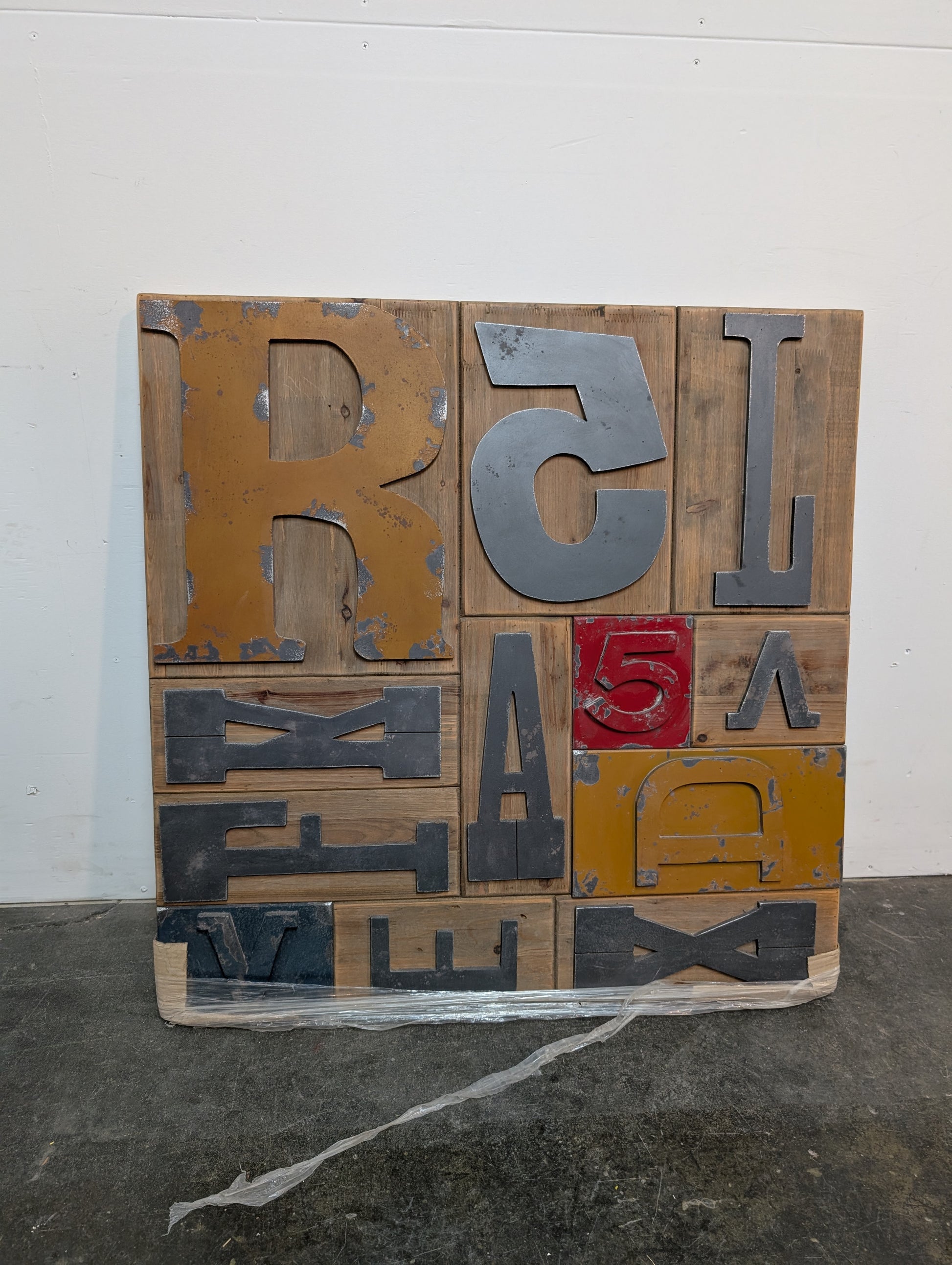 Grand cadre décoratif en bois avec lettres et chiffres en métal, 2 anneaux pour accrochage.