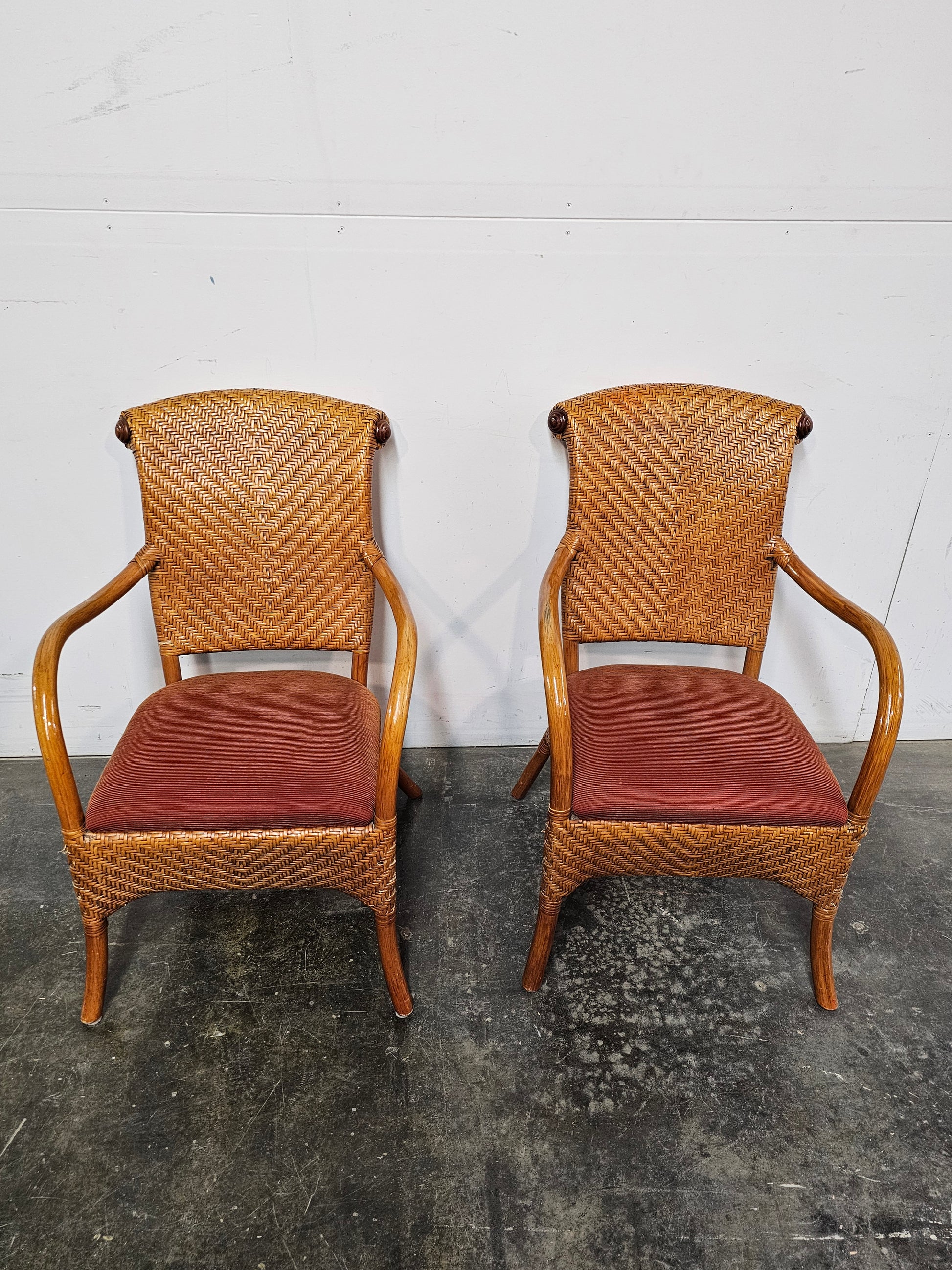 Fauteuil en bambou verni tressé en chevron, avec recouvrement en velours rouge corduroy légèrement cerné.