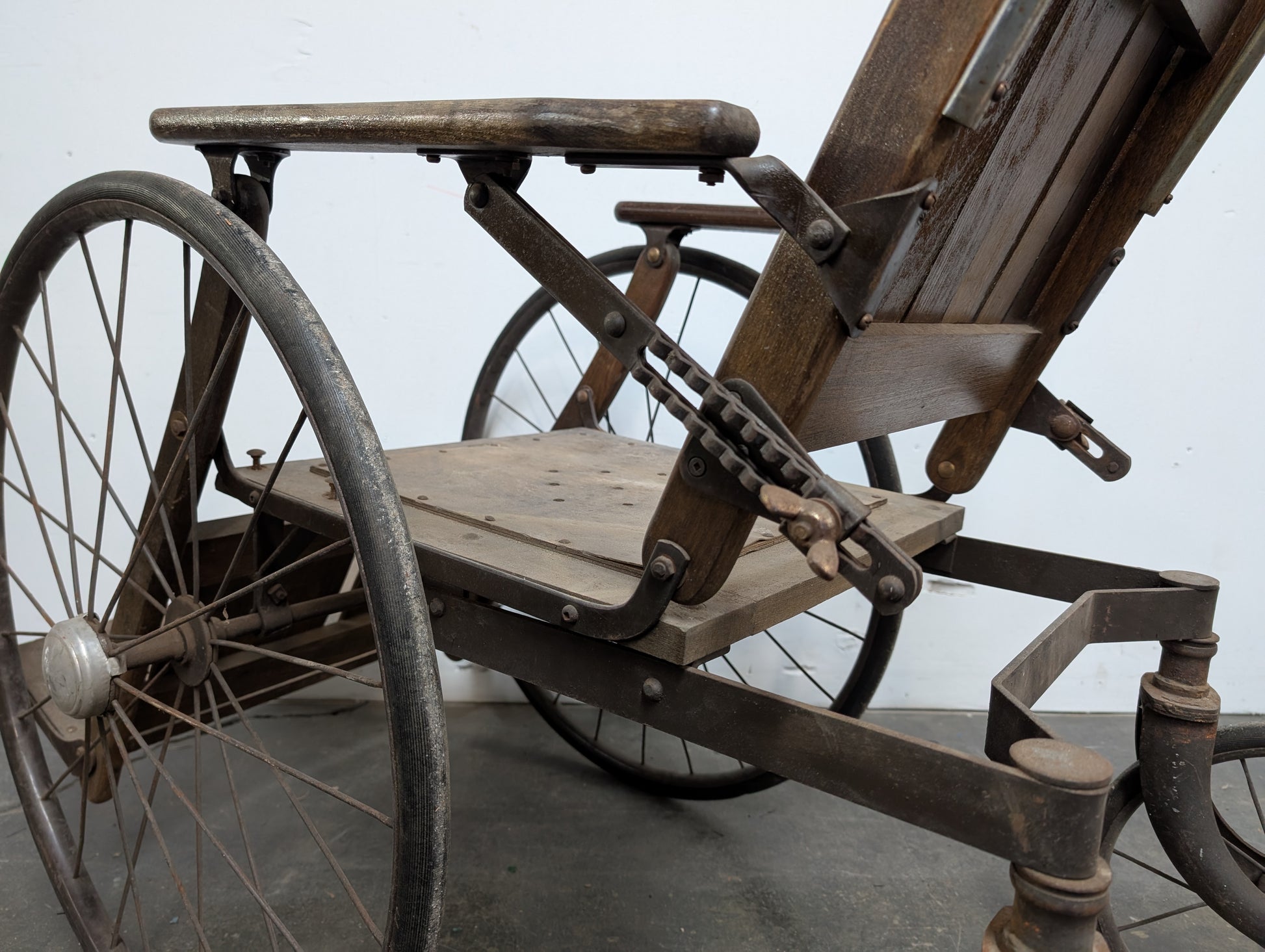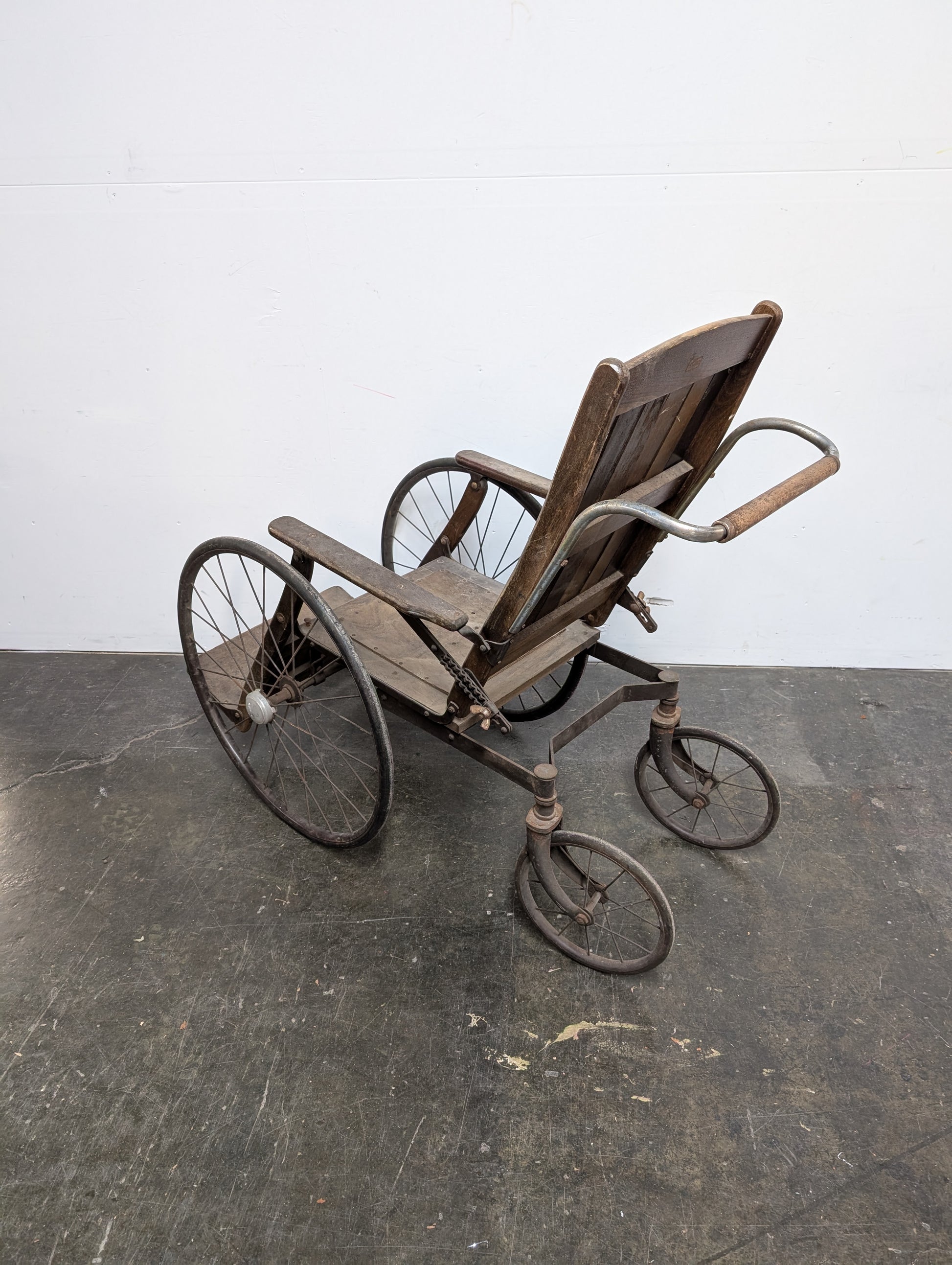 Chaise roulante en bois début 20e siècle. Très bon état. Fonctionnel, bois sain.