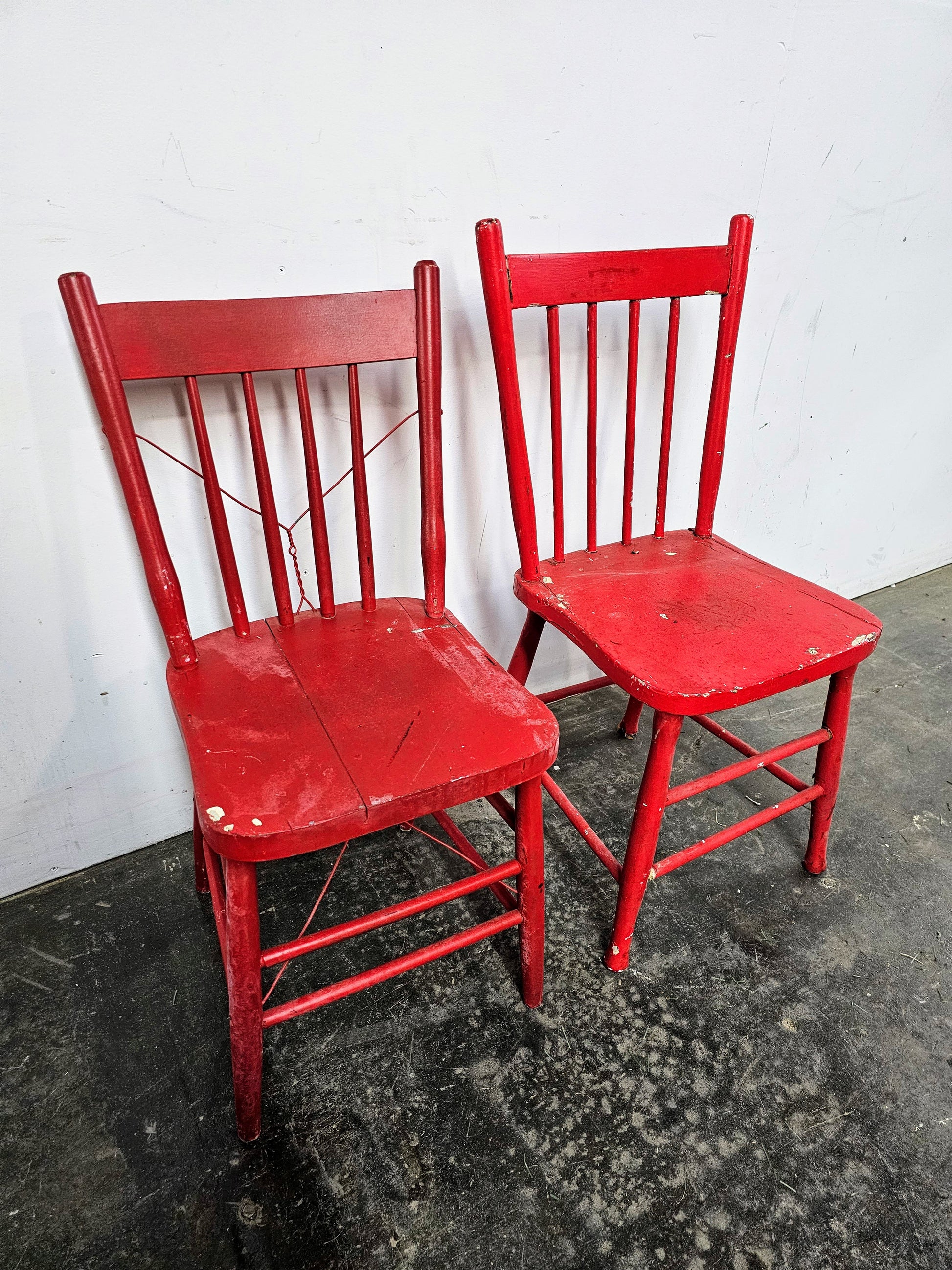 Chaises en bois, peintes en rouge vif. Une des deux chaises a un détail en fer au dossier et sous l'assise.