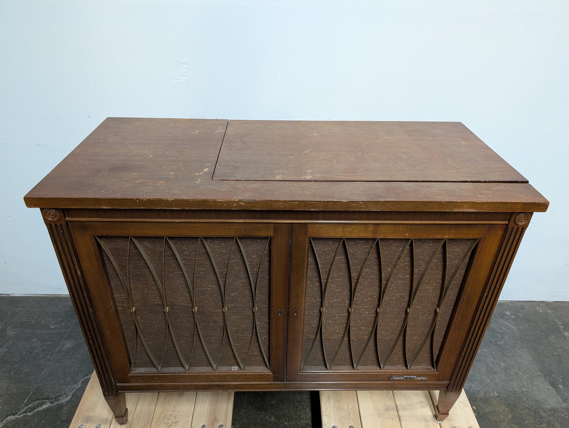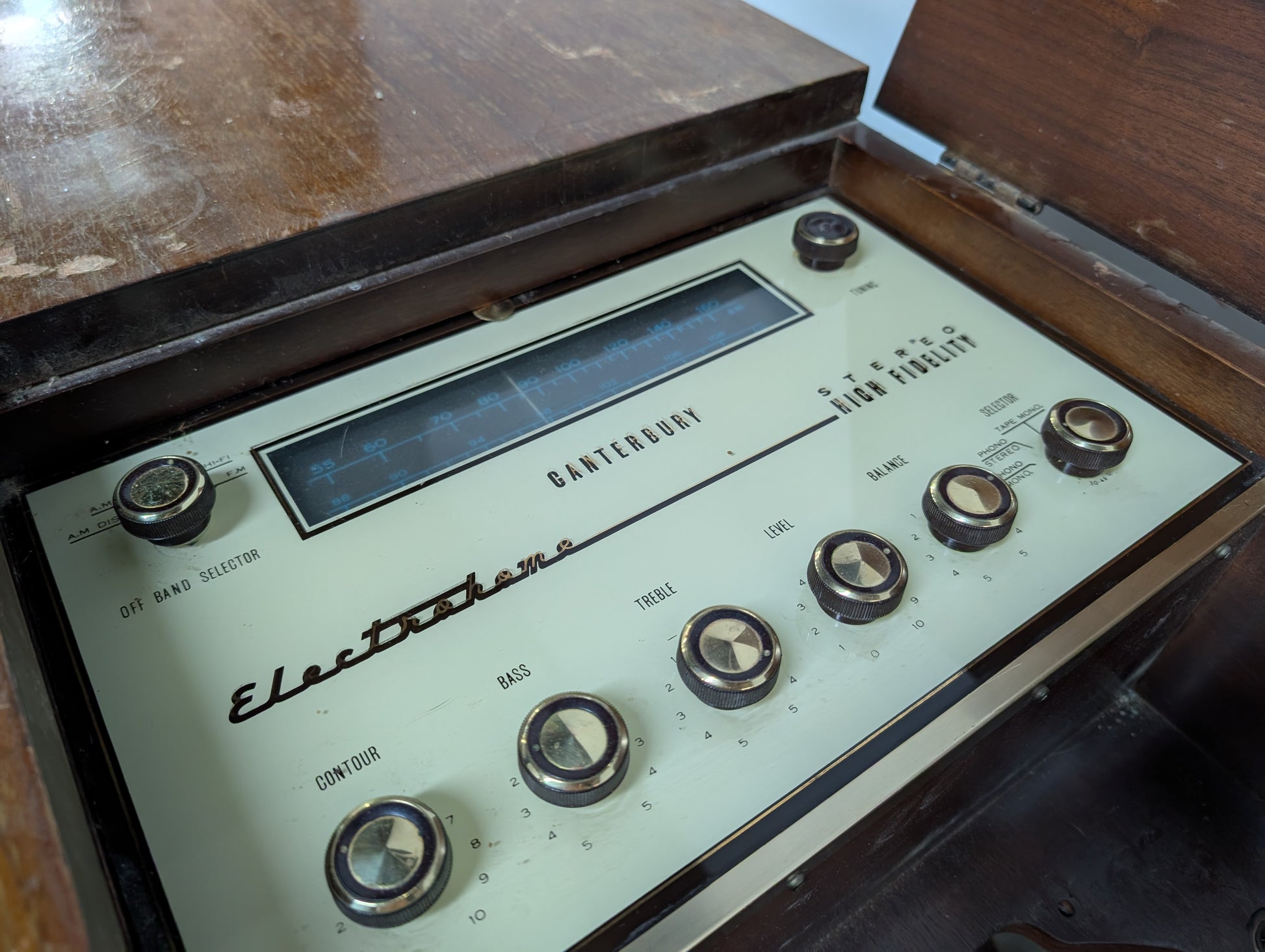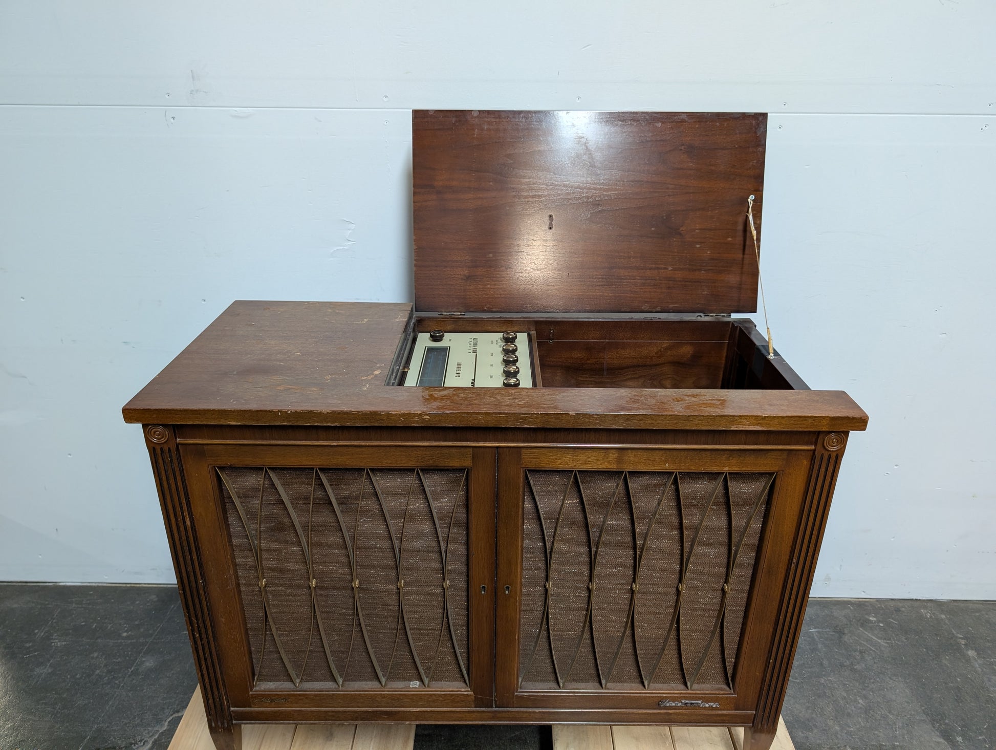 Ancien meuble tourne-disque en bois de marque Electrohome Sterio, non fonctionnel car le tourne disque fut retiré, l'ampli encore présent.