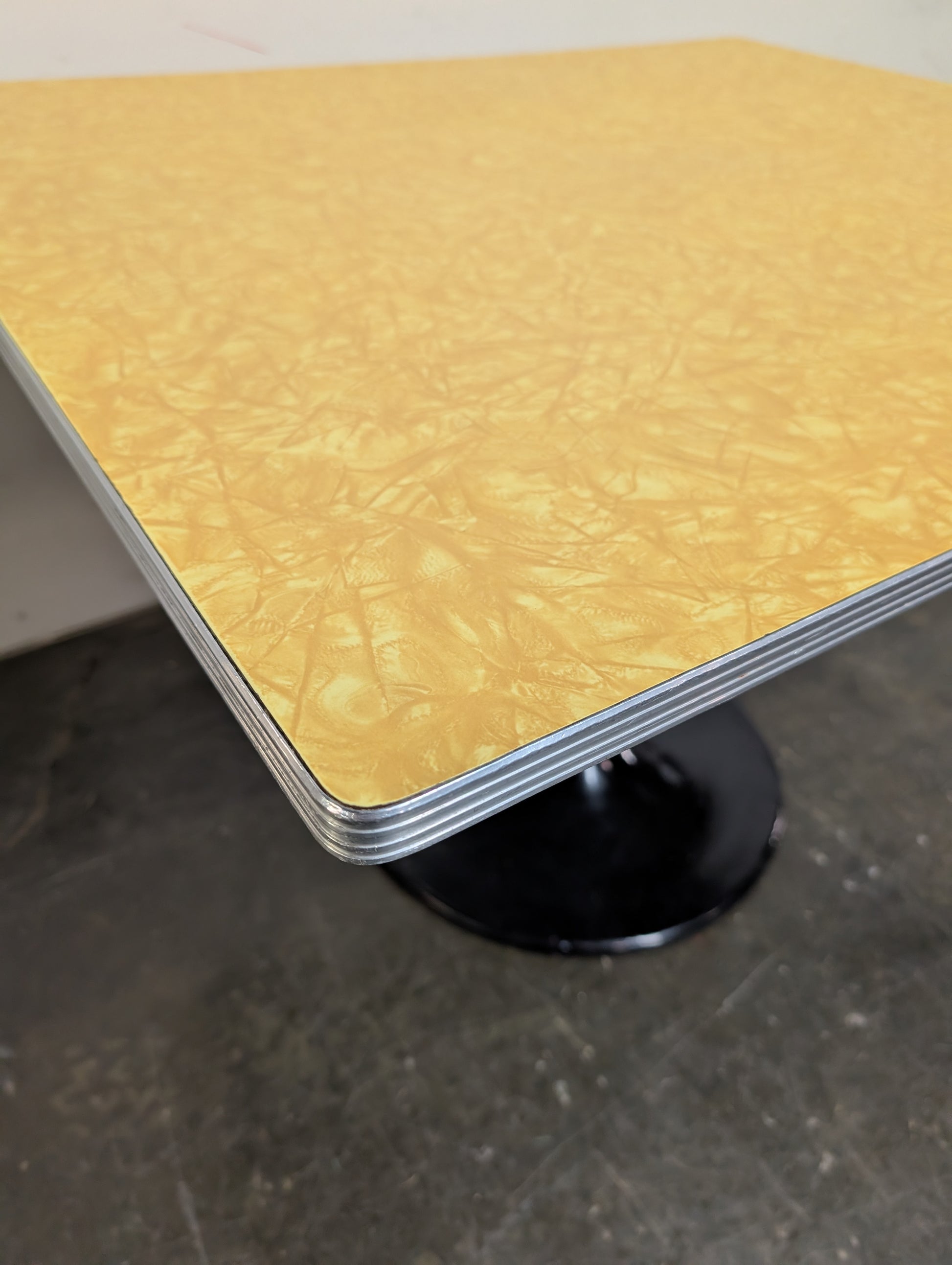 Table de cuisine 1960. Mélamine jaune. Pied tulipe peint en noir